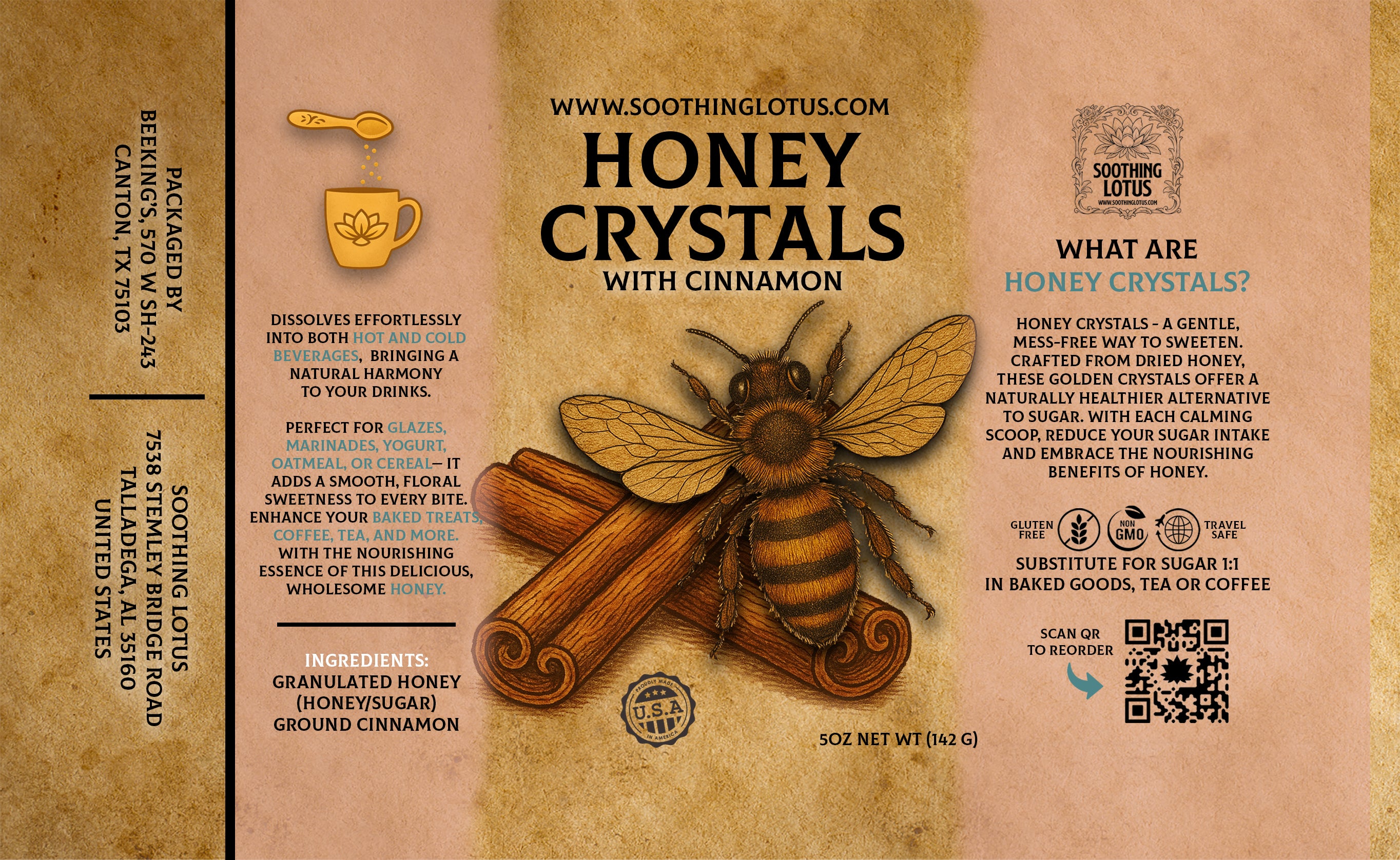Honey Crystals – A gentle, mess-free way to sweeten. Crafted from dried honey, these golden crystals offer a naturally healthier alternative to sugar. With each calming scoop, reduce your sugar intake and embrace the nourishing benefits of honey.