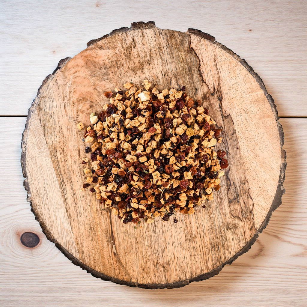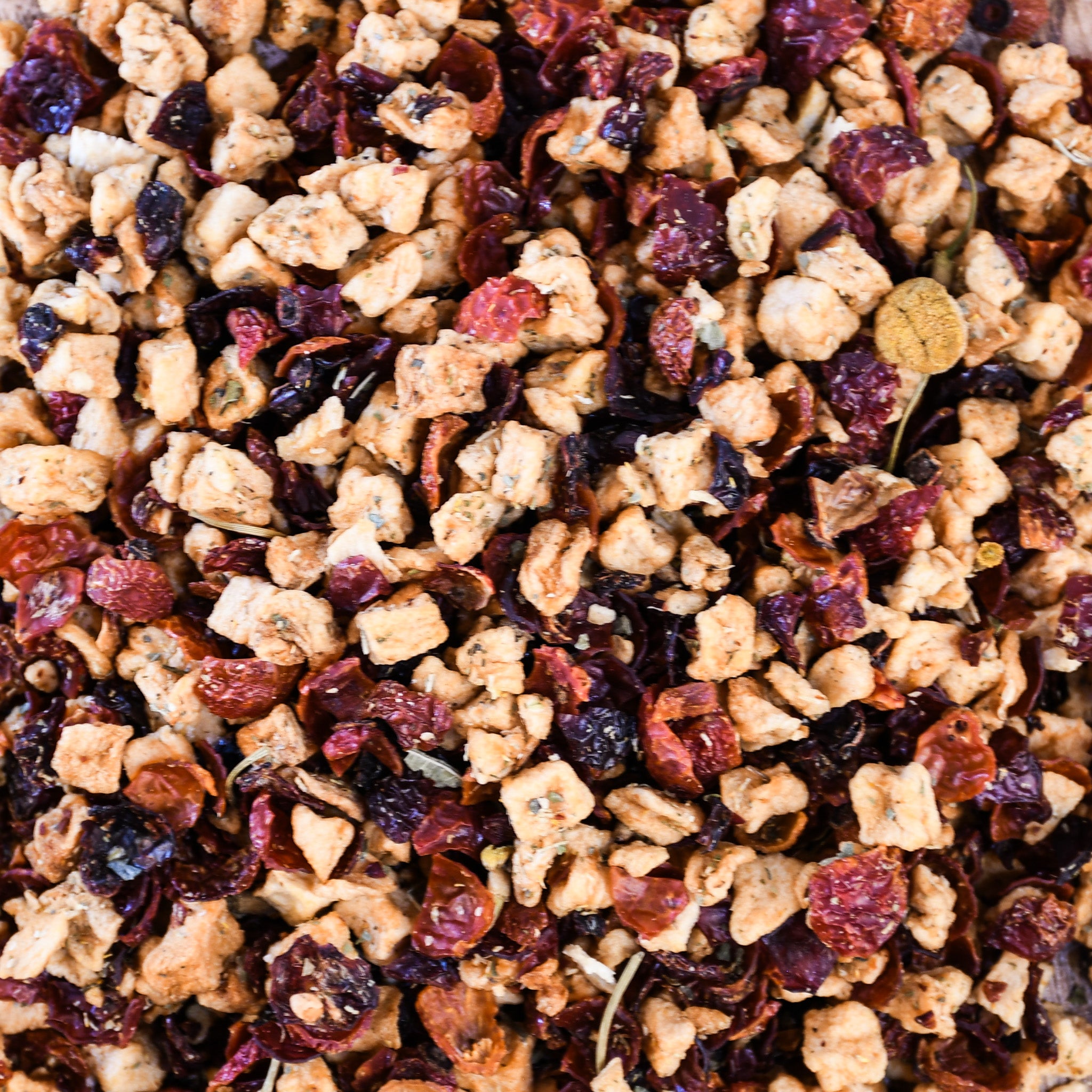 Blended with apple, rose hips, peach, pineapple, chamomile, lemon verbena, and soft floral notes, this infusion captures the feeling of sunlit fruit groves and dew-kissed petals. Light, calming, and naturally caffeine-free, it delivers a gentle balance of fruity brightness and floral softness.